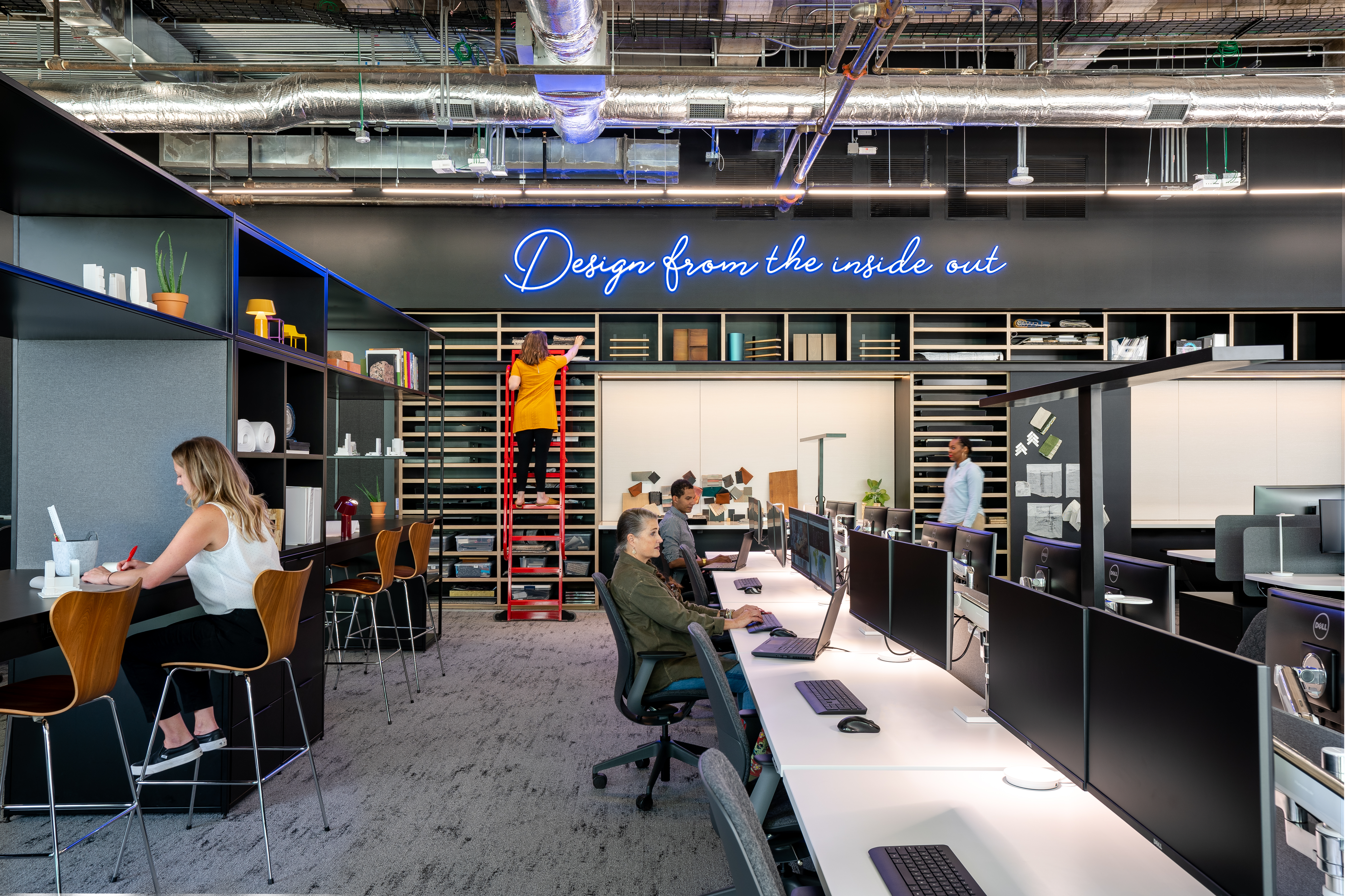 The Maker’s Space may look unassuming, but clients brought to this room can manipulate the color temperature of the lighting to showcase different finishes, fabrics and anything else in any CCT imaginable to fine-tune their designs.