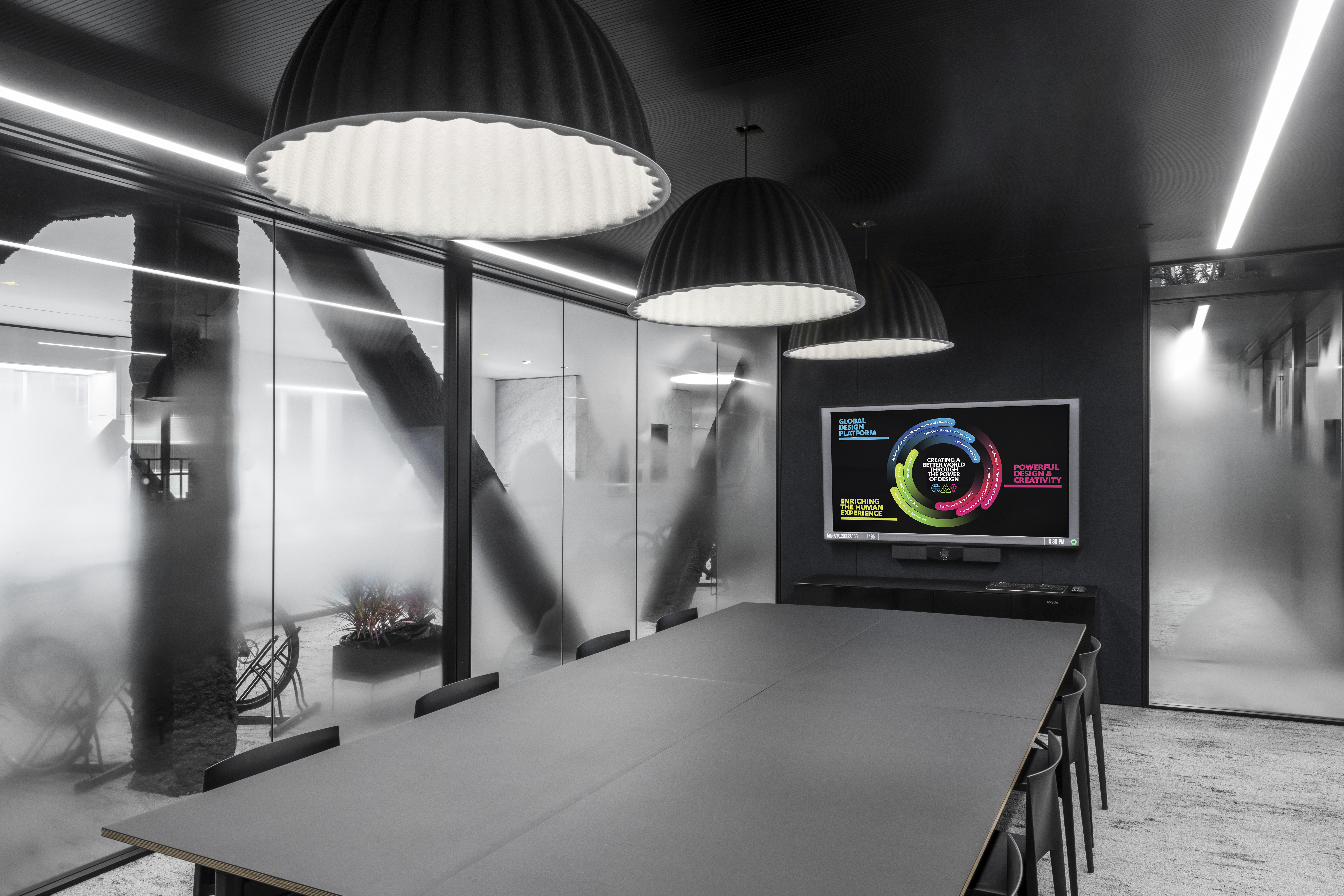 Conference rooms have toned down lighting to keep meetings as distraction free as possible. Simple wall washing and simple decorative pendants inside the rooms give way to more energetic lighting outside to better display the depth and character of space.