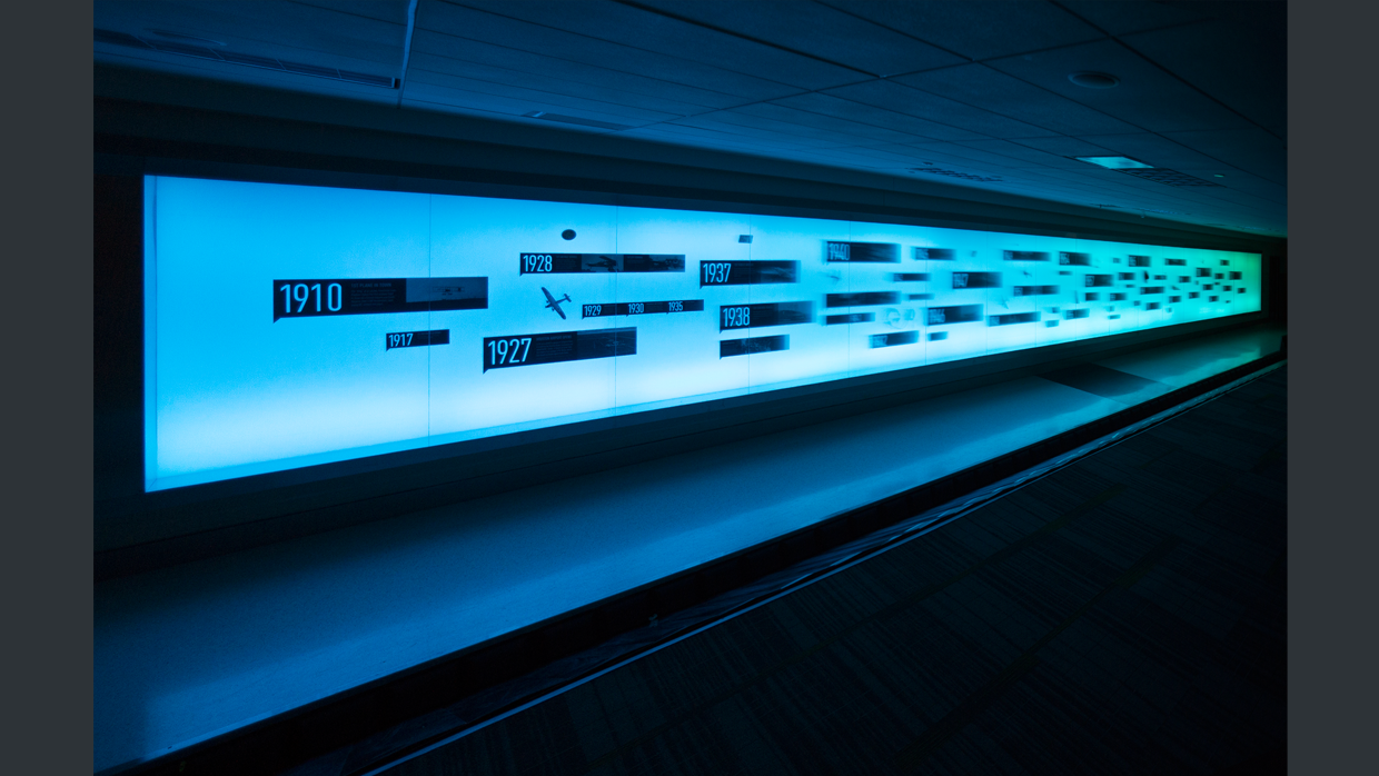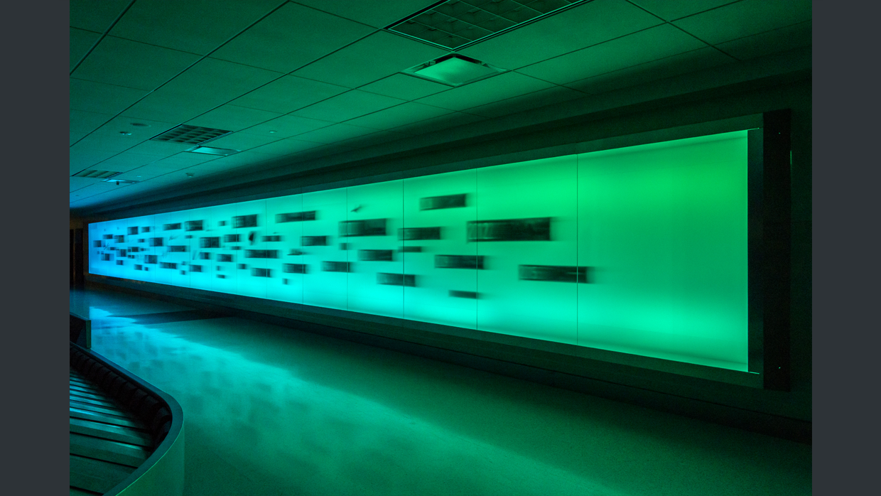 This dynamic art installation exists in Houston's Hobby Airport baggage claim. From a distance, the expansive wall of color-changing light serves as a bold and compelling piece of public art. Up close, an interpretive timeline is revealed, which tells the 75 year history of the airport. The effect of a 'timeline in motion' is enhanced not only with the movement of the colored lights, which gracefully roll from one end to the other, but also from a specialized glass in front that is transparent when viewed from straight on, but increasingly blurred from longer angles. The distortion creates the effect of blur and motion.