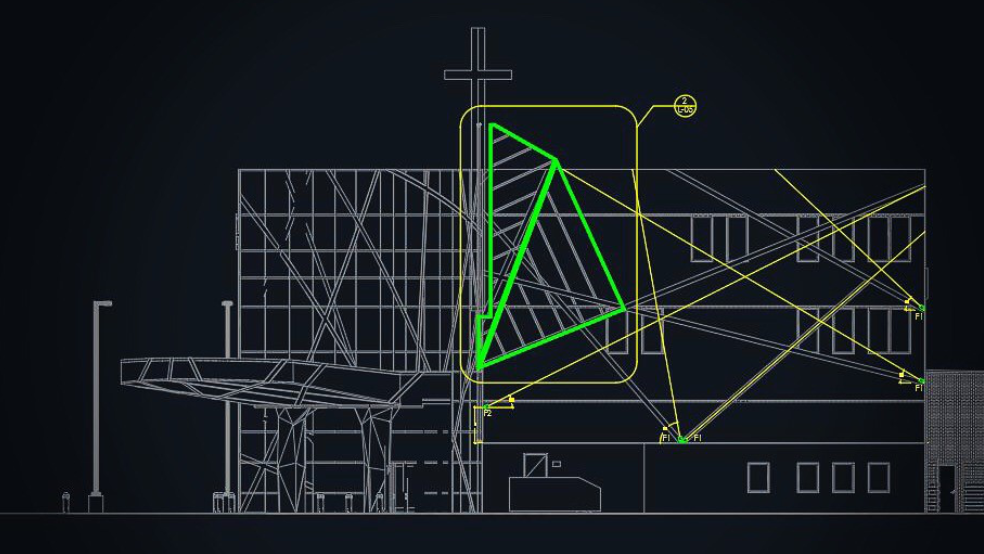 The building is highly visible from two major highways and they wanted to leverage that location with a design that would express the church's values as young and modern. The architect's initial thought was to wash the entire building in light, but that idea blended with surroundings and ultimately looked too commercial. G2LD devised the concept of using lines of light for a graphic design on the façade based on the architect's concept of painted lines intersecting across the building's walls and windows. Visually this was one of the defining characteristics of the building during the day, so the concept also carried into night.