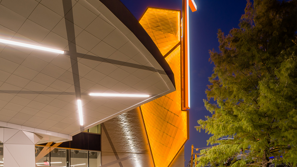 The innovative approach to façade lighting is not only eye catching from long distances, it is also extremely efficient. The flood light initially proposed by the client would have consumed 3,560w. At only 38w/each, these lines of light consume only 950w total—a win visually and environmentally.
