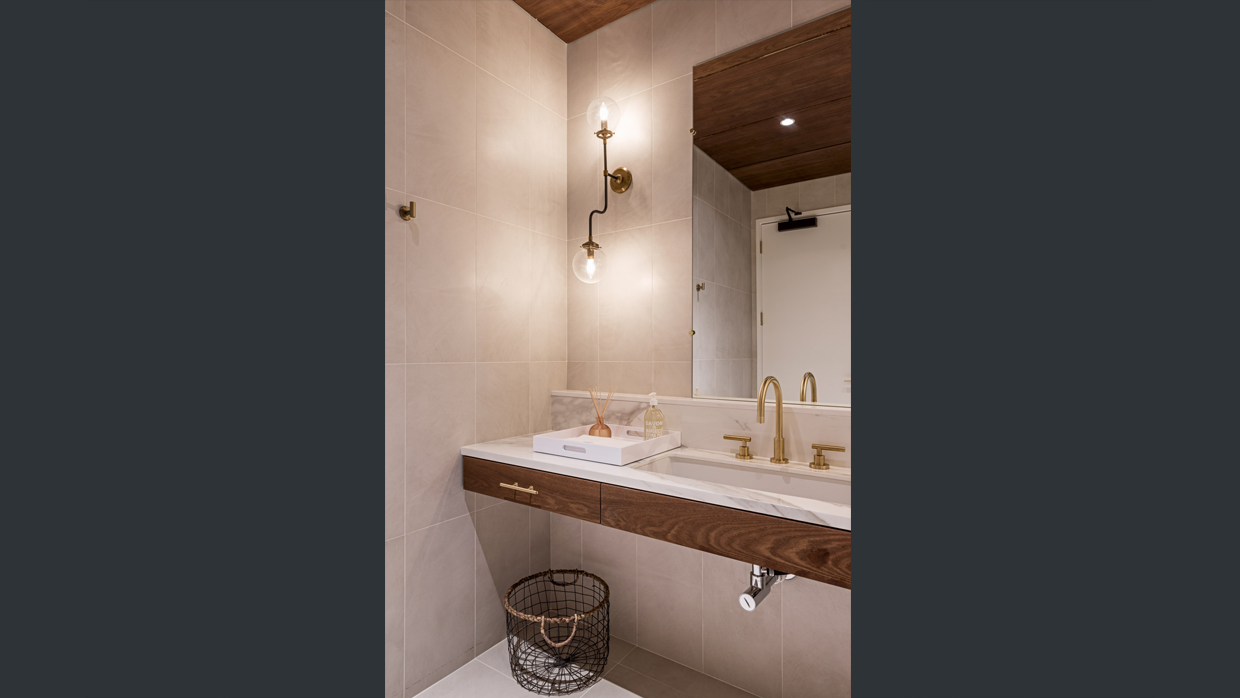 Modern industrial sconces in the restrooms give shadow-free illumination to faces while still contributing to the look and feel of the space.