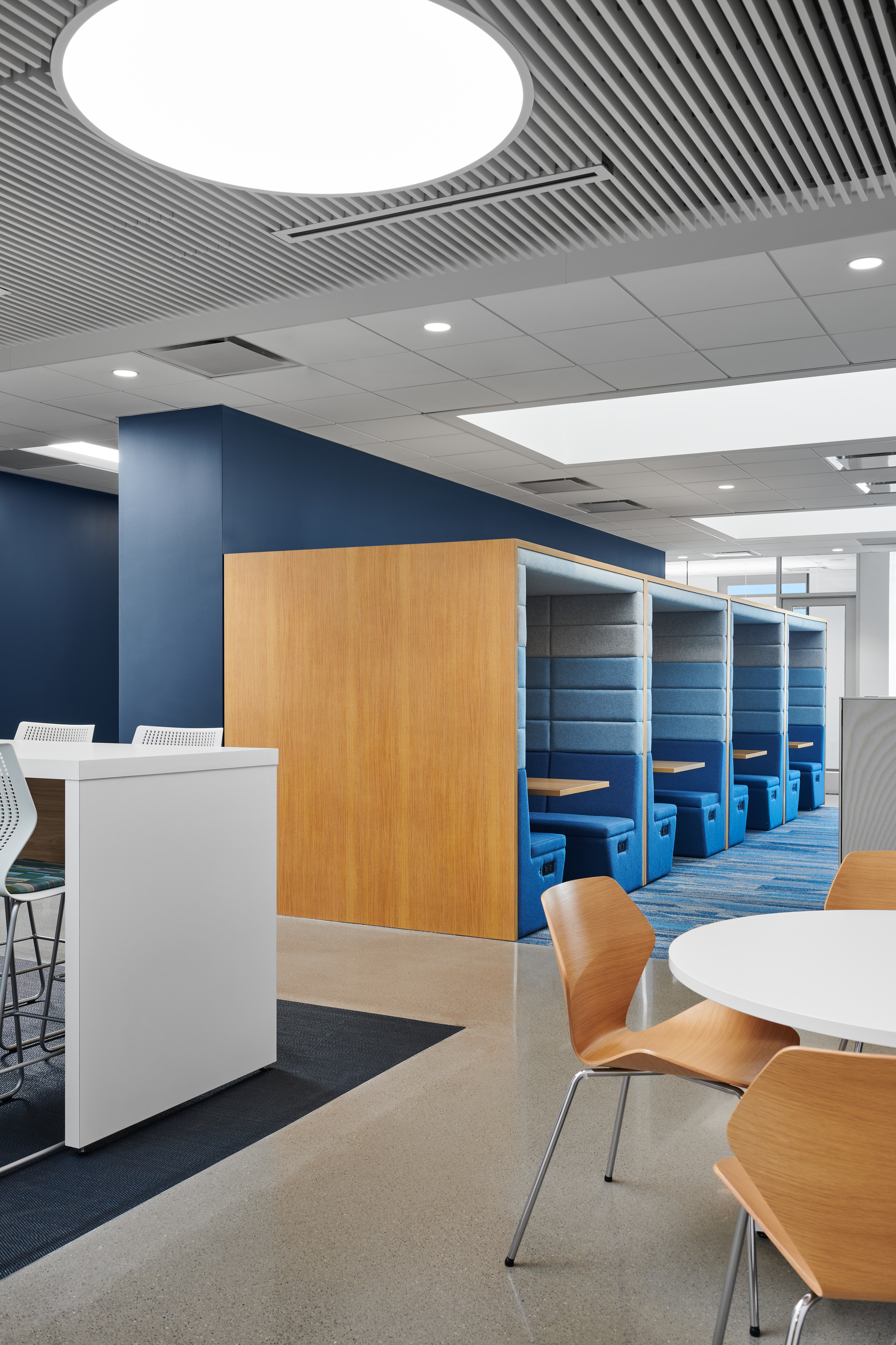 With lower ceiling heights and white finishes throughout, we were able to use highly efficient linear light fixtures to reinforce the ceiling pattern.