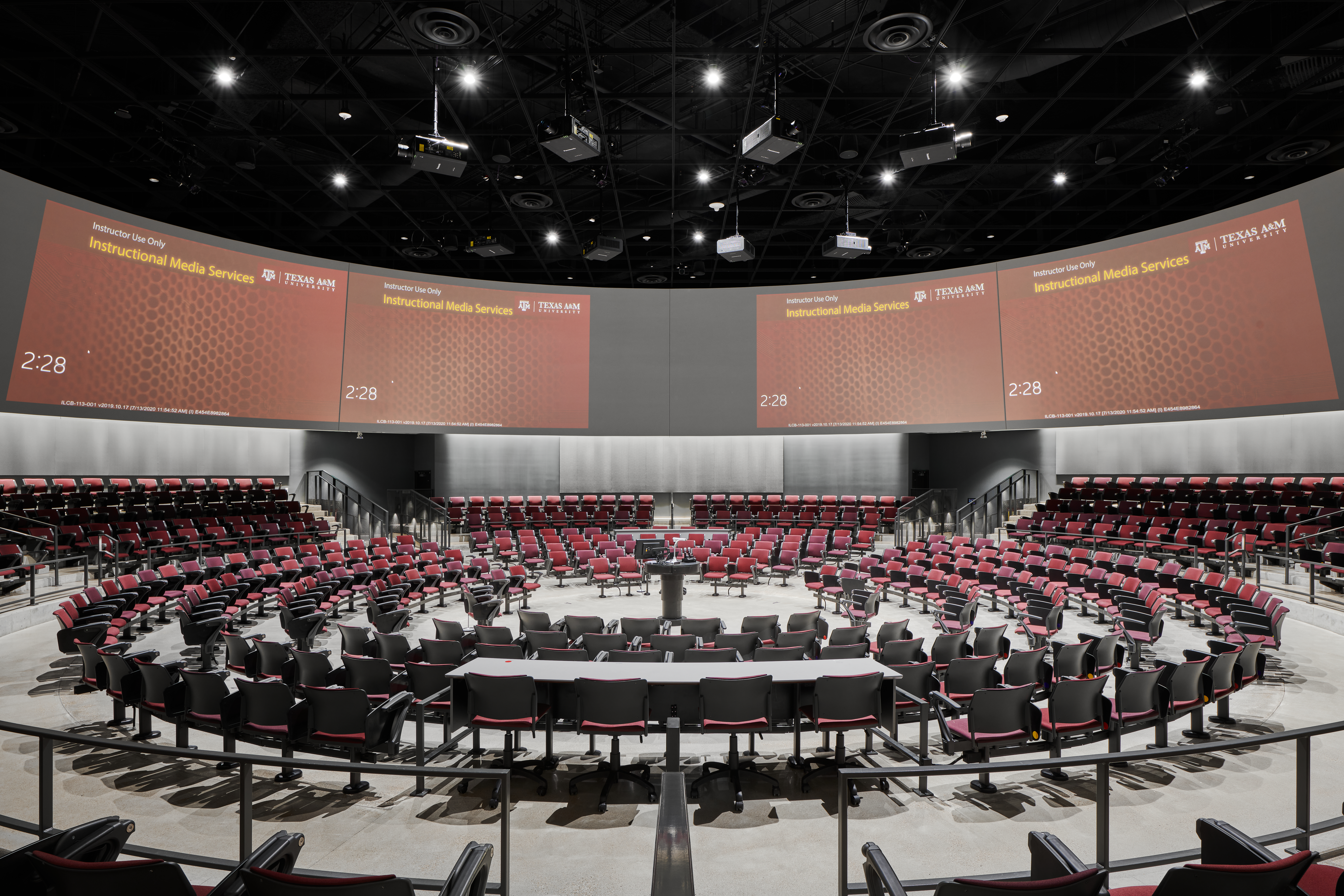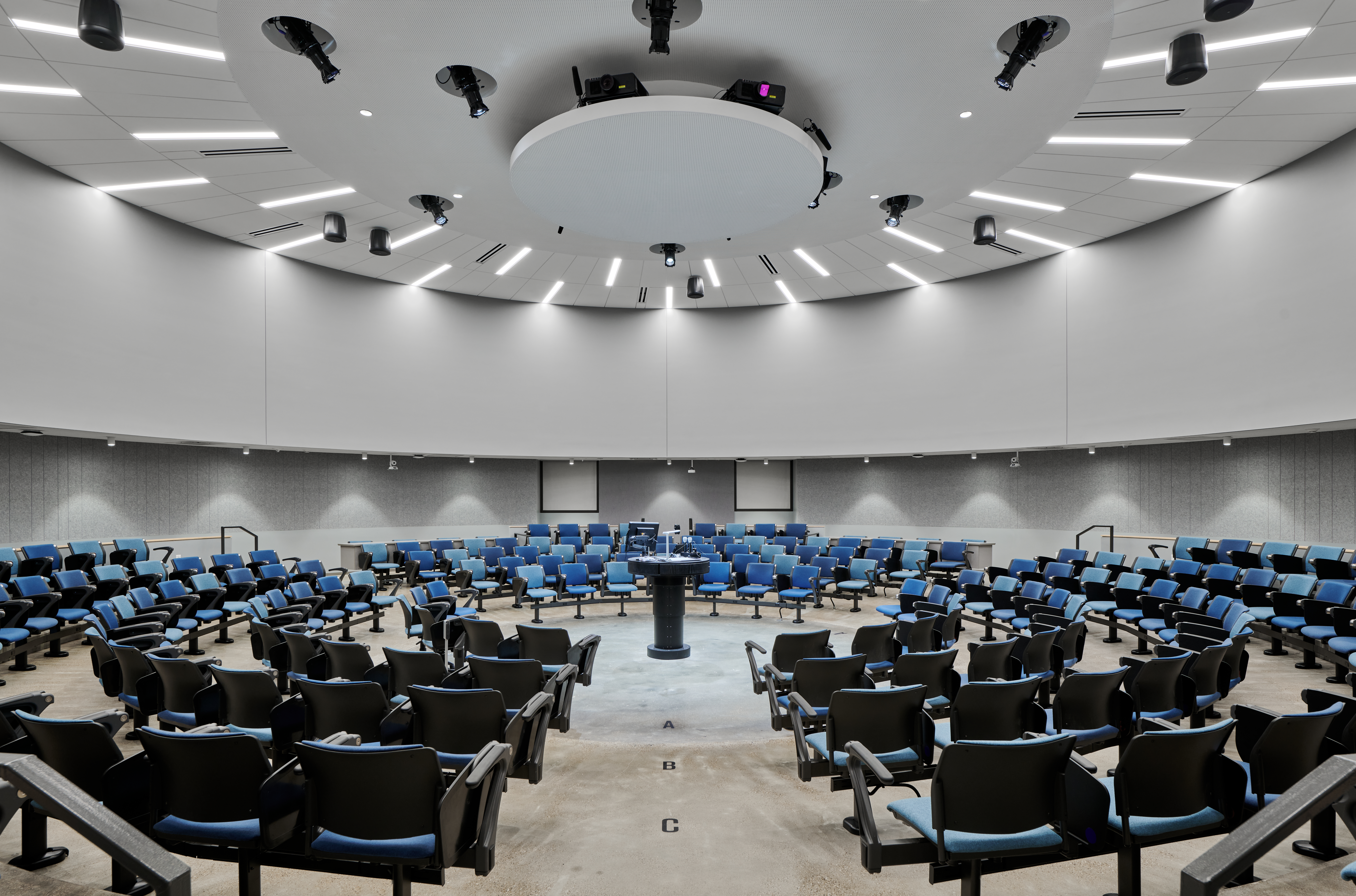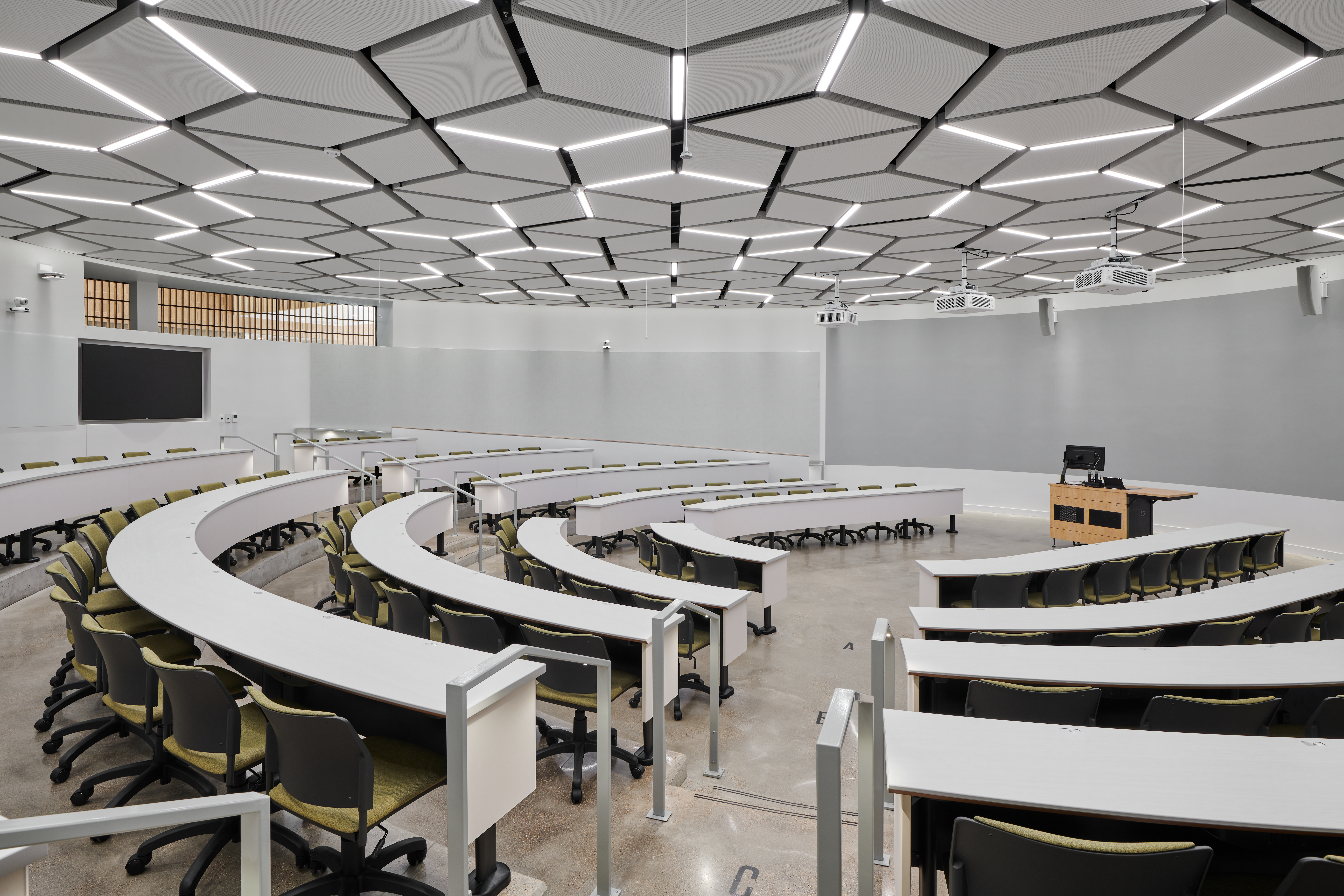 Keeping the lighting bright and uniform at the desks without washing out the perimeter projectors was a challenge that was achieved through careful study of beam spreads, angles, and photometrics. Black downlight cylinders against the black ceiling helps minimize the appearance of lighting to keep the focus where it belongs.